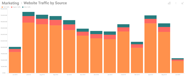 Include a Comparison You can both improve and add more insights to your visualizations by including comparisons to your charts. You can display your data based on date, like year over year, or you can use a comparison chart to compare two data points. For example, instead of just showing your Marketing spend, also add in your budget so you can see how you are stacking up against your given budget: