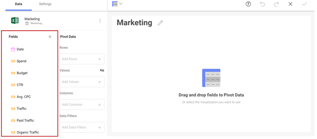 All of the available fields within your data source will appear on the left panel. Each field has an indicator that informs the users what field type each field is: Date, Value, Text. The plus icon in this panel allows you to either blend data sources or calculate a field:
